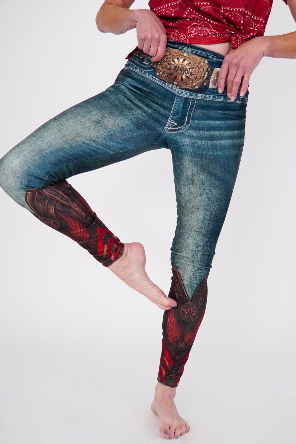 • Denim Jeans- this print showcases our western denim jean look in a comfortable legging. With attention to every detail, we created a faded jean look with our branded belt, pockets and boot detail to create the illusion of wearing real jeans, but much more comfortable. These leggings can go anywhere-workout, out to lunch or out on the town. Pairs well with our ladies short sleeve print shirt in red bandana print.